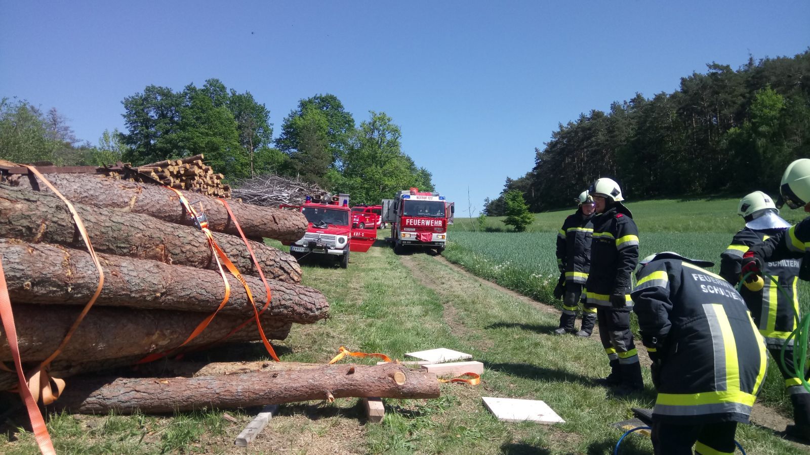Bei Holztransportarbeiten ist ein Anhänger mit Baumstämmen beladen umgekippt. Darunter wurde einer Person der Fuß eingeklemmt, während der Anhänger weiter zu kippen drohte und schließlich komplett auf die verletzte Person stürze.
