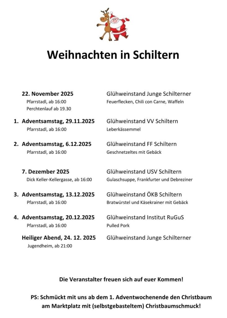 Auch heuer lädt Schiltern an den Adventwochenenden zu stimmungsvollen Glühweinabenden mit hausgemachten Spezialitäten ein. Vereine aus dem Ort sorgen für warme Getränke, herzhafte Schmankerln und winterliche Atmosphäre – vom Perchtenlauf bis zum gemeinsamen Christbaumschmücken. Kommt vorbei und genießt die Vorweihnachtszeit mitten im Dorf!